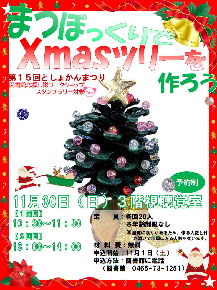 ★<申込制>図書館応援し隊ワークショップ まつぼっくりでクリスマスツリーを作ろう 申し込み開始日:11月1日(土) 申込方法:市立図書館に電話で 午前9時から午後5時(休館日を除く) 材料費 :無料 定 員 :各20人 |