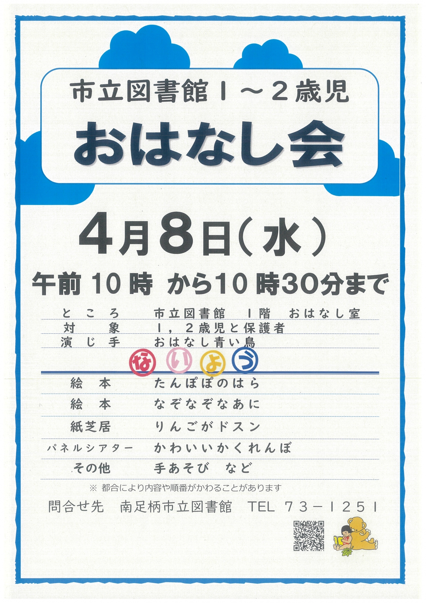 おはなし会参加にあたってのお願い 新型コロナウイルス感染防止のため、ご協力をお願いいたします。 ● 熱のある方、体調のすぐれない方は、参加をご遠慮ください。