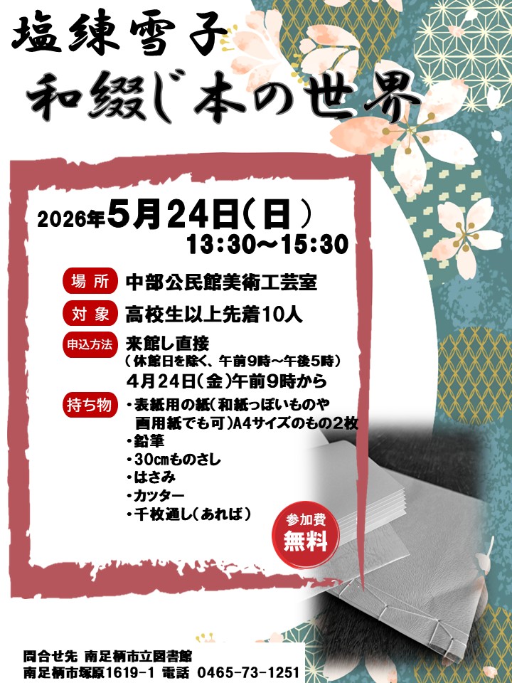 | 内 容 | 自分の好きな模様の紙を表紙にしたオリジナルの和綴じ本を作ることができます。 |