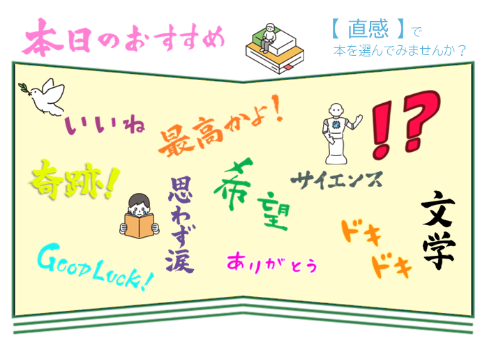 本を選ぶとき、何か基準はありますか? 「あ、おもしろそう!!」や気になるタイトルで 手に取ったことはありませんか? この展示ではぜひ、直感で本を手に取ってみてください。